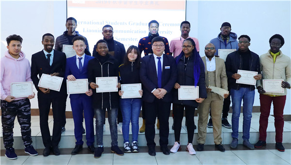 典礼现场播放了留学生留念视频,一幕幕温馨而又充满回忆的片段,回顾了留学生们在学校学习和生活的点点滴滴,令人感怀在辽传的岁月充实而美好。典礼现场,老师们向留学生颁发了留学生毕业证书及优秀留学生证书。