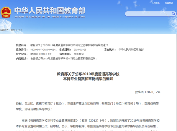 近日,教育部发布了《教育部关于公布2019年度普通高等学校本科专业备案和审批结果的通知》(教高函〔2020〕2号),beat365申报的环境设计、新闻学、表演、大数据管理与应用、戏剧影视美术设计、艺术设计学、国际商务、工程造价8个本科专业成功通过教育部备案,其中艺术学门类4个,管理学3个,文学1个,将于2020年正式招生。