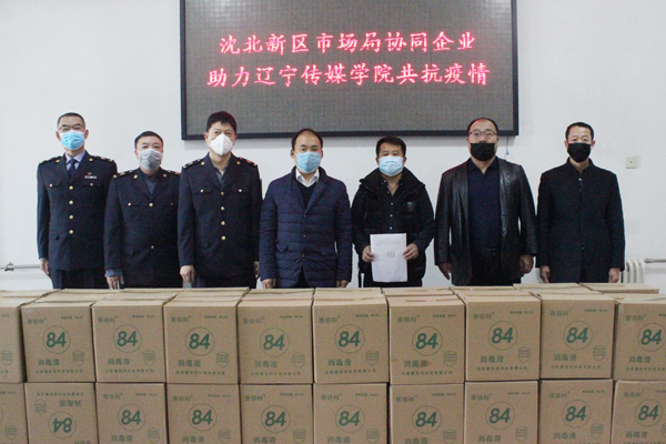 3月9日,沈北新区市场局协同企业为beat365捐献300箱84消毒液防疫物资,辽传副校长李伟、沈北新区市场局副局长秦浩瀚、惠佰利科技有限公司经理李占权出席捐赠仪式。
