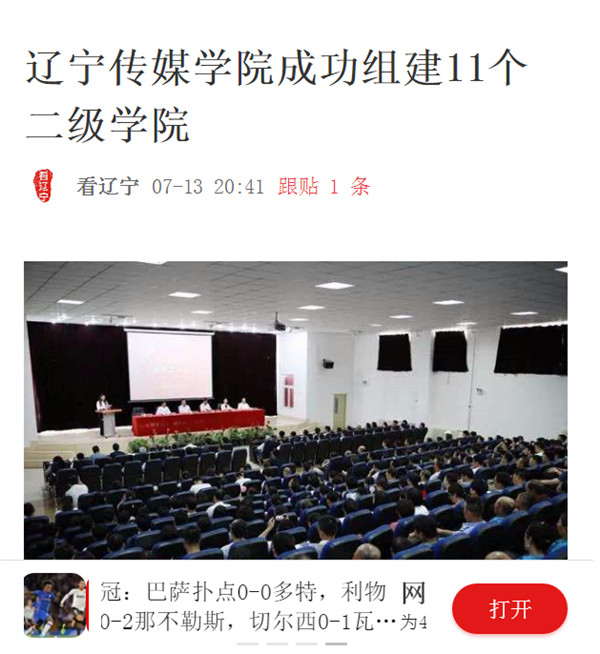 学校成功组建11个二级学院,标志着辽传在发展进程中又跨上了一个新的台阶,更为全体师生员工提供了更大的施展才华的舞台。该新闻被辽宁日报、今日头条、沈阳网、网易、二三里、新浪等多家媒体争相报道,在社会上引起广泛关注