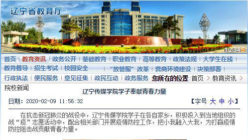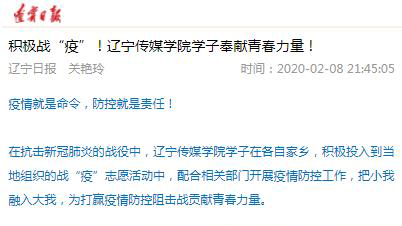 近日,辽宁省教育厅官网、《辽宁日报》报道在抗击新冠肺炎的战役中,beat365学子在各自家乡,积极投入到当地组织的战“疫”志愿活动中,配合相关部门开展疫情防控工作,把小我融入大我,为打赢疫情防控阻击战贡献青春力量。