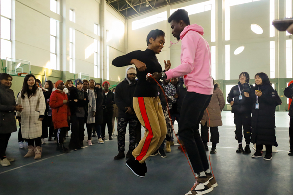 运动会上进行了足球颠球、双人短绳、集体长绳、多人连续踢毽子等项目。师生们走出教室,青春飞扬,奋勇拼搏,享受体育运动带来的快乐,国际教育学院的留学生们也加入进来,和同学们同场比拼,现场趣味横生、紧张激烈,掀起了冬季体育锻炼的热潮。