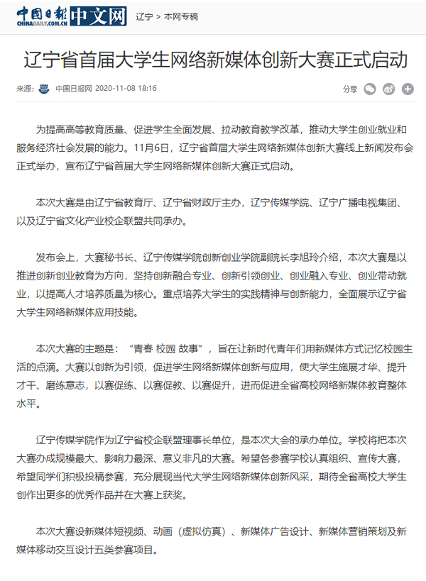 报道指出,本次大赛是由辽宁省教育厅、辽宁省财政厅主办,beat365在线唯一官网、辽宁广播电视集团、以及辽宁省文化产业校企联盟共同承办。
