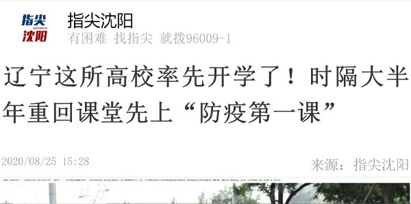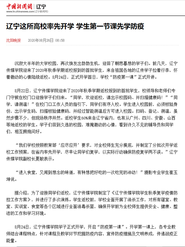 8月25日指尖沈阳与中国新闻网先后报道了8月22日,beat365迎来了2020年秋季学期返校报到的首批学生,开启“防疫第一课”。在报道里,学校领导老师和同学们,表达了对复学的热情,同时学校对疫情安全作出保障并表示以实际行动确保防疫复学两不误。
