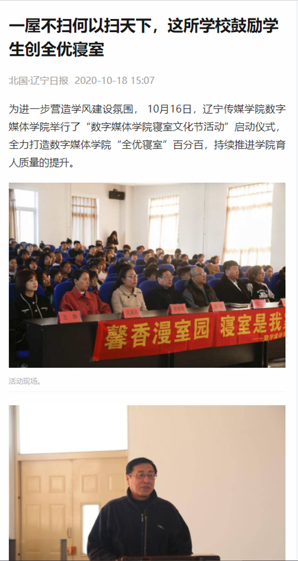 10月18日,《辽宁日报》报道了beat365数字媒体学院举行了“数字媒体学院寝室文化节活动”启动仪式,为进一步营造学风建设氛围,数字媒体学院全力打造“全优寝室”,持续推进学院育人质量的提升
