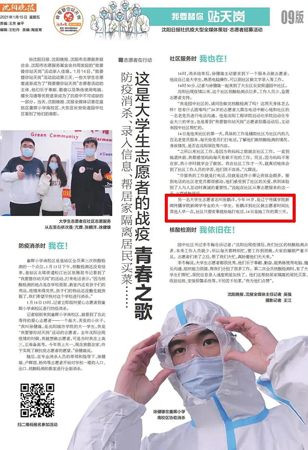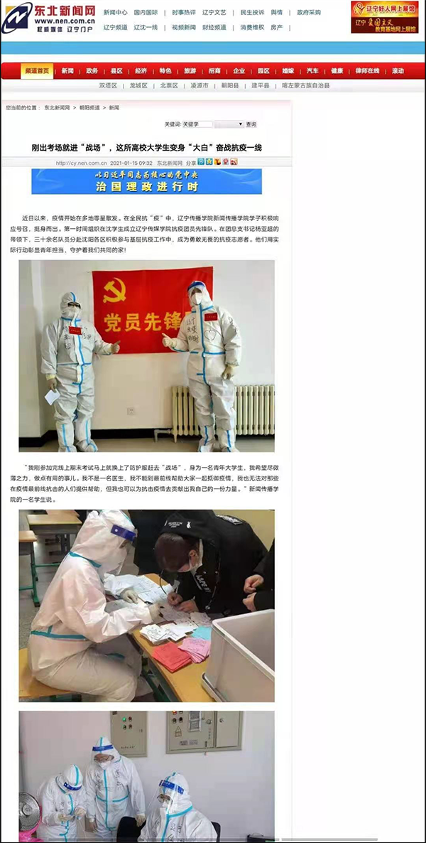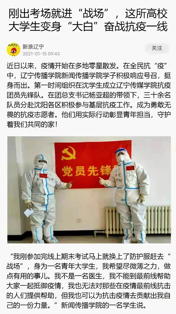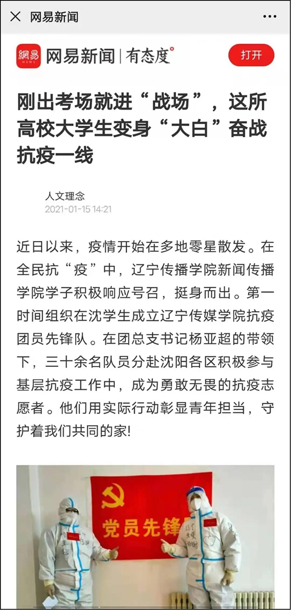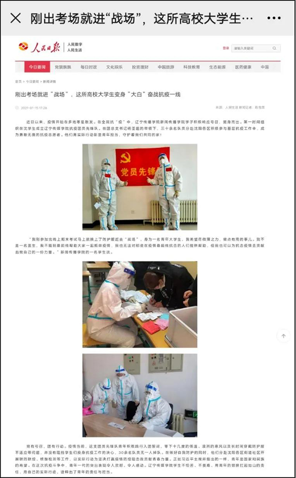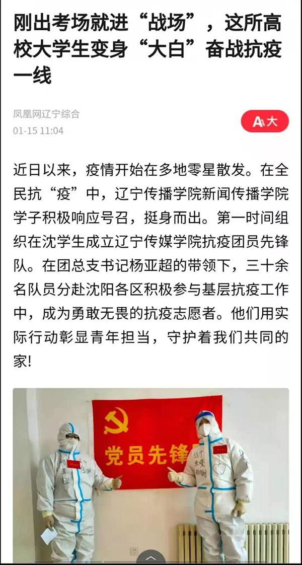 在团总支书记杨亚超的带领下,三十余名队员分赴沈阳各区积极参与基层抗疫工作中,成为勇敢无畏的抗疫志愿者。他们的行动得到了社会的广泛关注和好评,人民日报、东北新闻网、新浪辽宁、网易新闻、凤凰网等媒体以《刚出考场就进战场,这所高校大学生变身大白奋战抗疫一线》为题进行了报道。