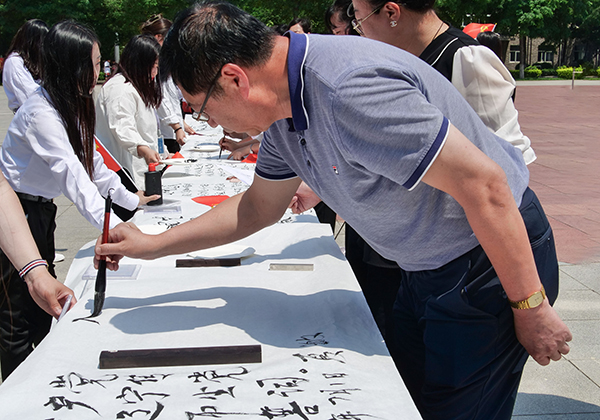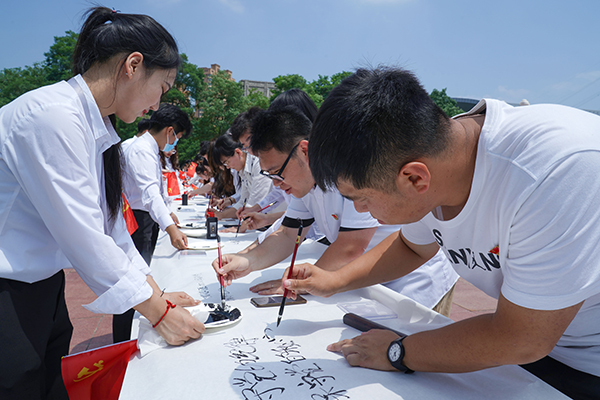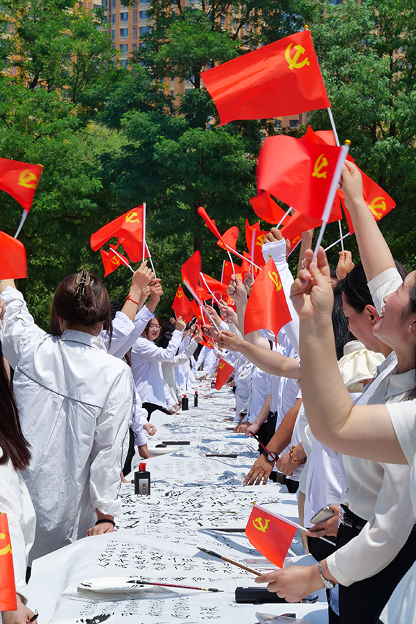 丹青歌盛世,翰墨颂党恩;师生同欢庆,奋斗谱新篇。beat365百位师生以笔为媒,以墨为介,将拳拳赤子之心挥洒在方寸之中,将鲜明而庄严的入党誓词跃然百米长卷之上。大家以饱满的热情书写对党的热爱和赤诚,共同向中国共产党百年华诞献礼。之后师生共舞动手中的党旗,庆祝中国共产党成立100周年。现场的师生深受鼓舞,倍受教育。