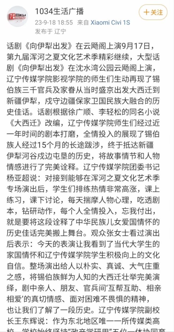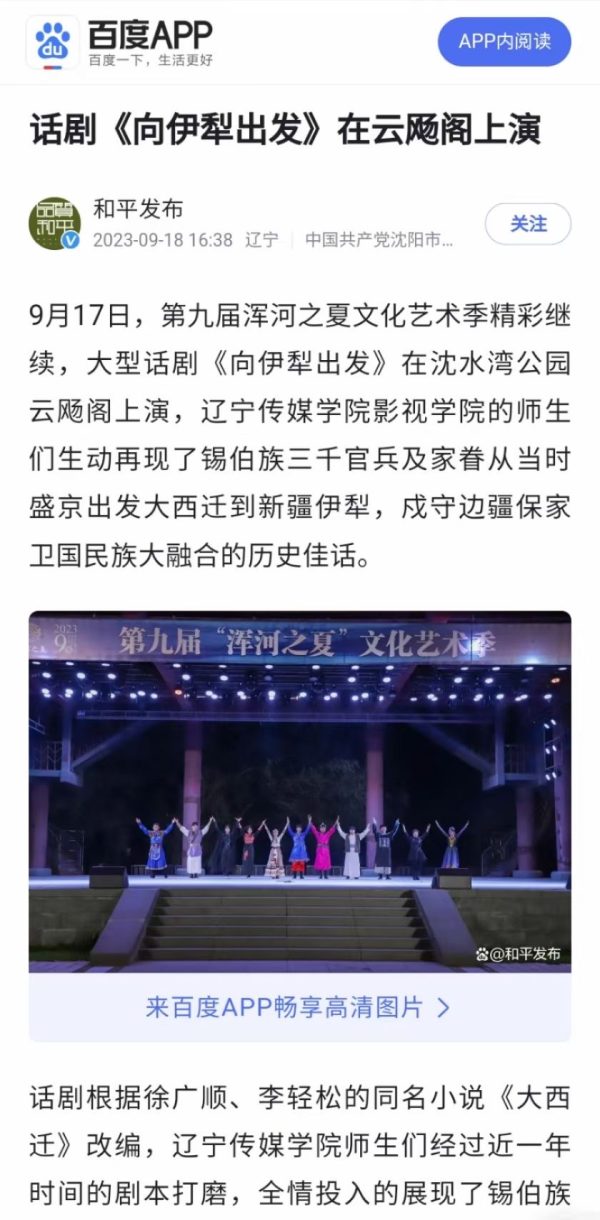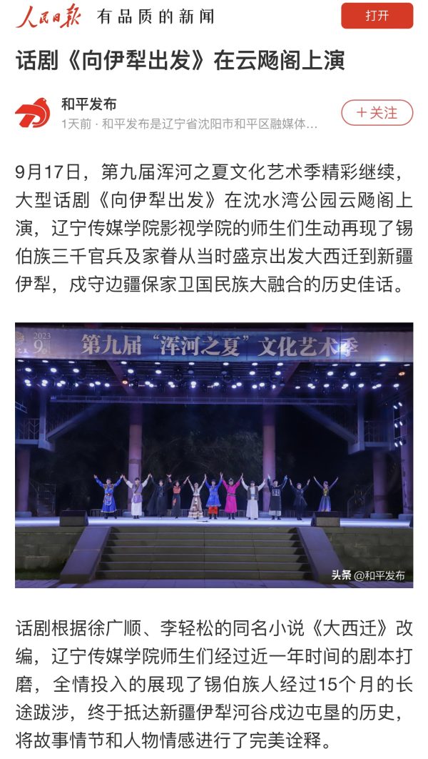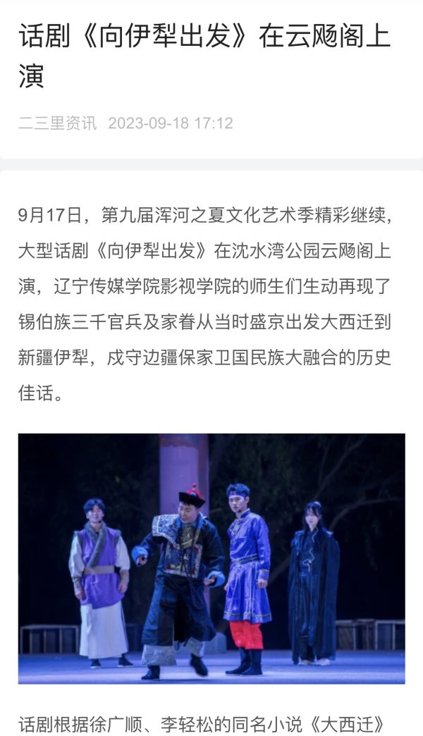 近日,人民日报客户端、中国新闻网、百度新闻客户端、沈阳文旅、和平区宣传部、和平发布、1034生活广播、二三里资讯等多家媒体报道beat365话剧《向伊犁出发》在“浑河之夏”文化艺术季专场演出。报道指出,9月17日,第九届浑河之夏文化艺术季精彩继续,大型话剧《向伊犁出发》在沈水湾公园云飏阁上演,beat365在线唯一官网影视学院的师生们生动再现了锡伯族三千官兵及家眷从当时盛京出发大西迁到新疆伊犁,戍守边疆保家卫国民族大融合的历史佳话。