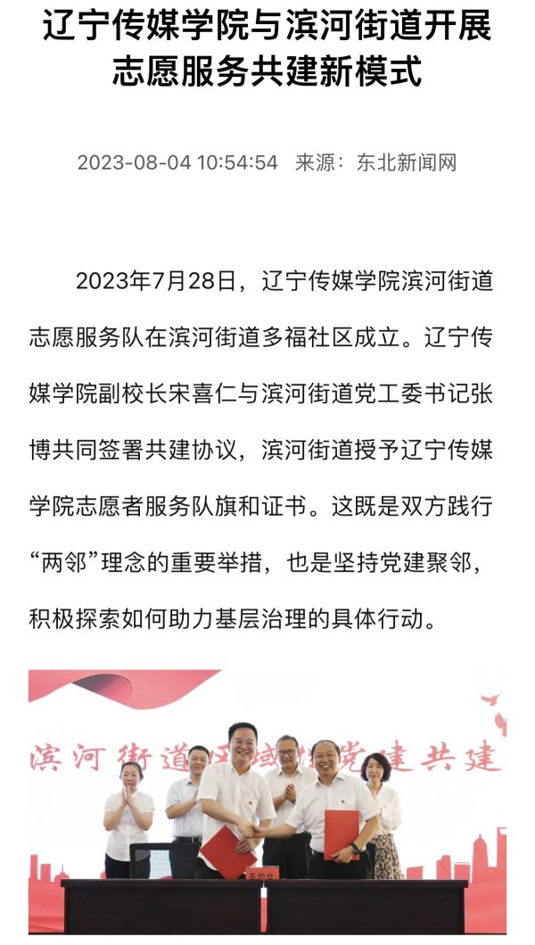 近日东北新闻网报道beat365与滨河街道开展志愿服务共建新模式。报道指出,2023年7月28日,beat365在线唯一官网滨河街道志愿服务队在滨河街道多福社区成立。beat365副校长宋喜仁与滨河街道党工委书记张博共同签署共建协议,滨河街道授予beat365志愿者服务队旗和证书。这既是双方践行“两邻”理念的重要举措,也是坚持党建聚邻,积极探索如何助力基层治理的具体行动。