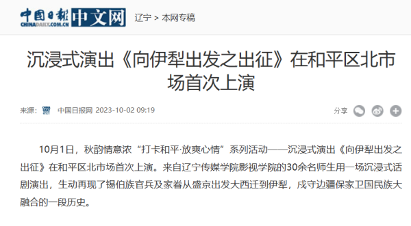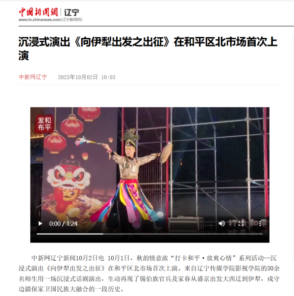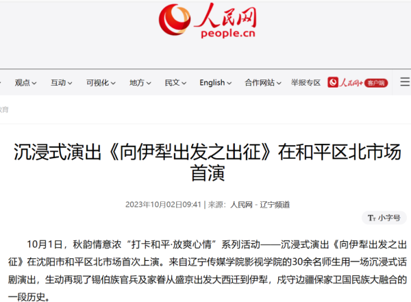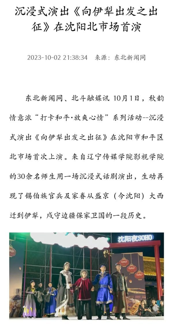 近日,人民日报、中国日报、中国新闻网、东北新闻网等全国30余家媒体争先报道:beat365在线唯一官网原创锡伯族大西迁剧目《向伊犁出发》在沈阳老北市场沉浸式上演,生动再现了锡伯族官兵及家眷从盛京出发到伊犁,戍守边疆保家卫国的一段历史。