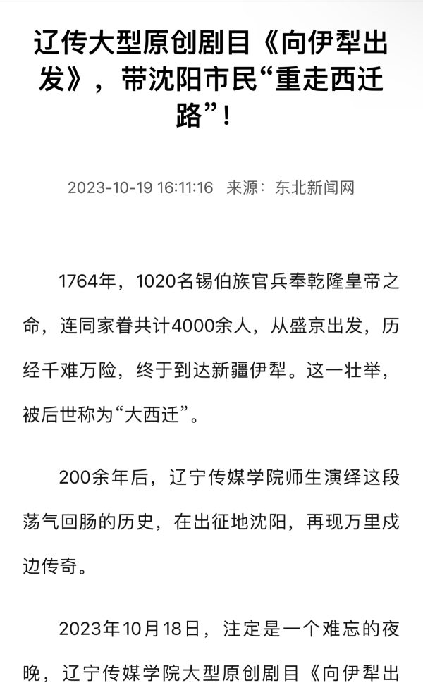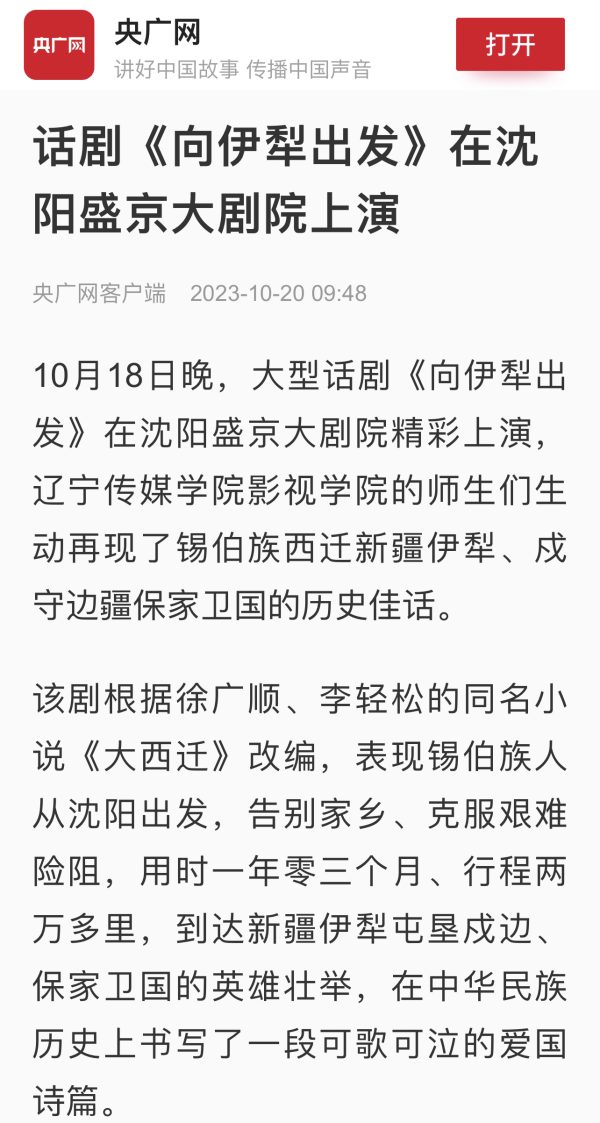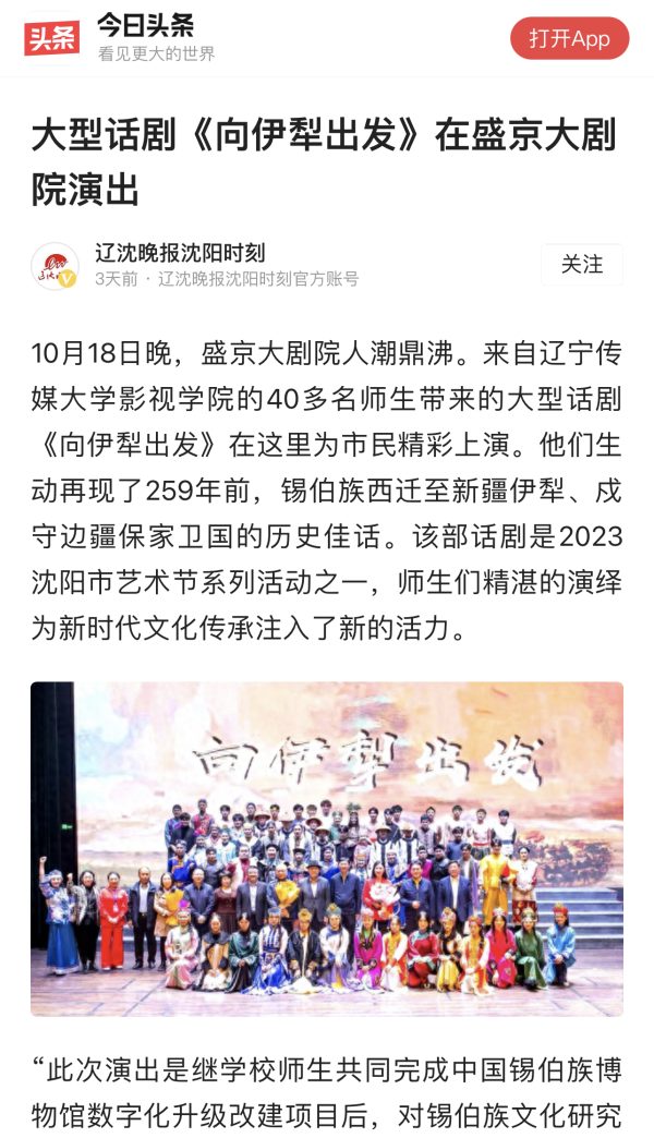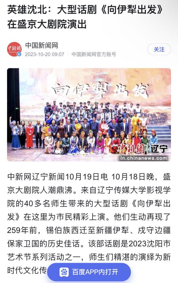 近日,中国新闻网、央广网、东北新闻网、今日头条、新浪报道、辽宁日报客户端辽望等多家媒体争相报道:beat365大型话剧《向伊犁出发》在盛京大剧院演出。