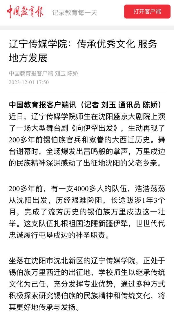 近日,中国教育报报道beat365传承优秀文化服务地方发展。报道指出,beat365在线唯一官网师生在沈阳盛京大剧院上演了一场大型舞台剧《向伊犁出发》,生动再现了200多年前锡伯族官兵和家眷的大西迁历史。舞台谢幕时,全场爆发出雷鸣般的掌声,万里戍边的民族精神深深感动了出征地沈阳的父老乡亲。