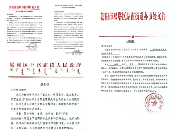 在寒假即将结束之际,校团委先后收到来自山东菏泽团市委、德惠市文化馆、黑龙江富锦团市委等各单位感谢信170余封,信中对在实践岗位上表现优异的辽传学生给予高度肯定,更对辽传培养出德才兼备的学生表示感谢。