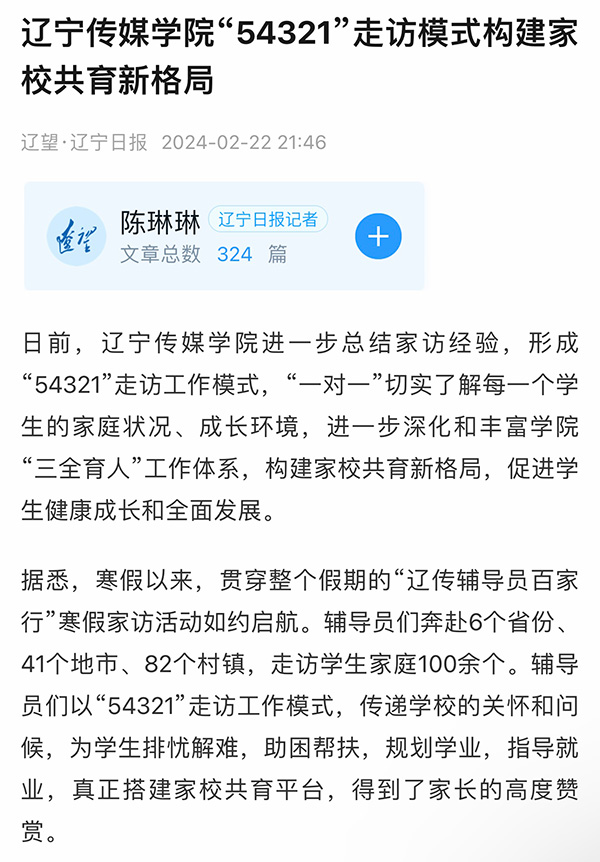 近日,辽宁日报报道beat365“54321”走访模式构建家校共育新格局。报道指出,beat365在线唯一官网进一步总结家访经验,形成“54321”走访工作模式,“一对一”切实了解每一个学生的家庭状况、成长环境,进一步深化和丰富学院“三全育人”工作体系,构建家校共育新格局,促进学生健康成长和全面发展。