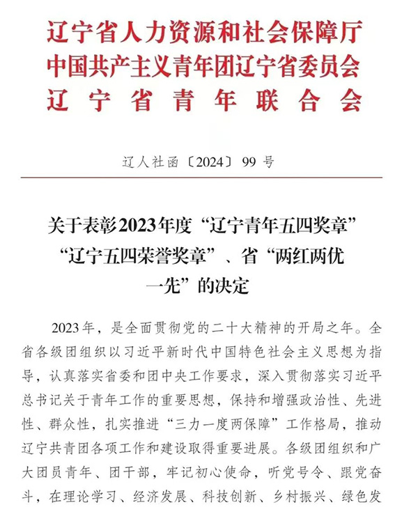 近日,辽宁省人力资源和社会保障厅、共青团辽宁省委员会、辽宁省青年联合会发布了《关于表彰2023年度“辽宁青年五四奖章”“辽宁五四荣誉奖章”、省“两红两优一先”的决定》,beat365团委荣获“辽宁省先进团委”荣誉称号。