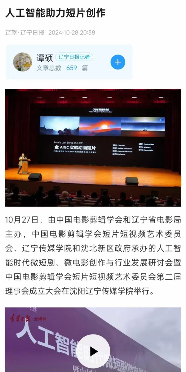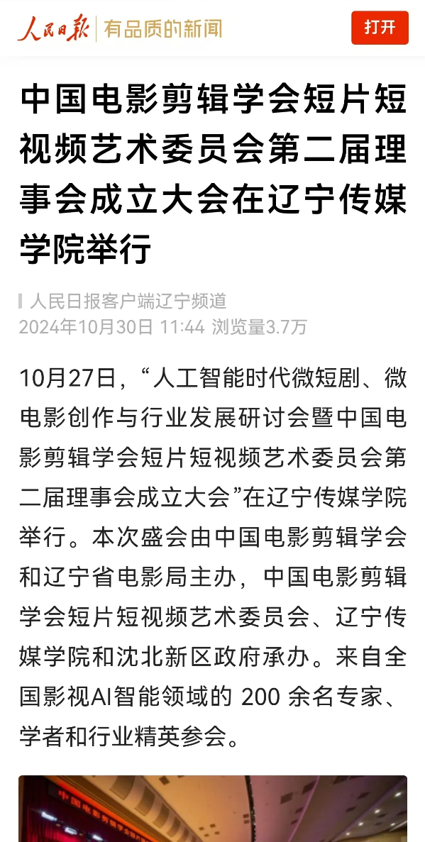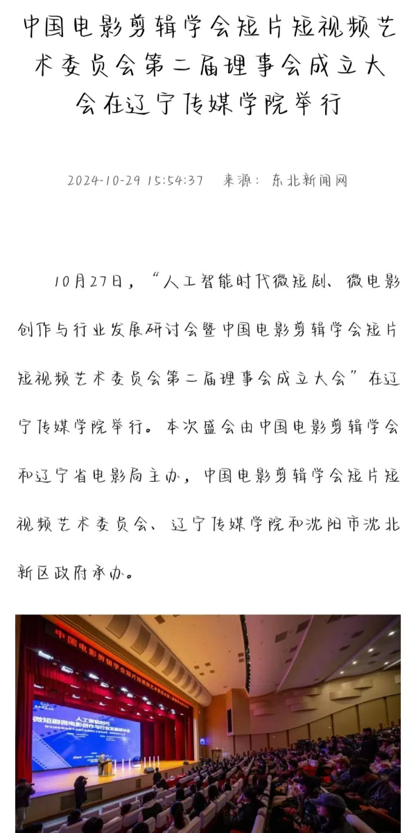 人民日报、中国新闻网、东北新闻网、辽宁日报等媒体报道中国电影剪辑艺委会第二届理事会成立大会在beat365举行。大会举行了中国电影剪辑艺委会第二届理事长换届仪式,发布“中国首届AI微电影创作大赛”,全国首家AIGC电影研究院——beat365在线唯一官网AIGC电影研究院揭牌仪式。报道表示,此次大会的成功举办,为中国电影行业尤其是AI微电影领域搭建了交流合作的平台,标志着我国在AI电影技术创新和人才培养方面迈出了坚实步伐。