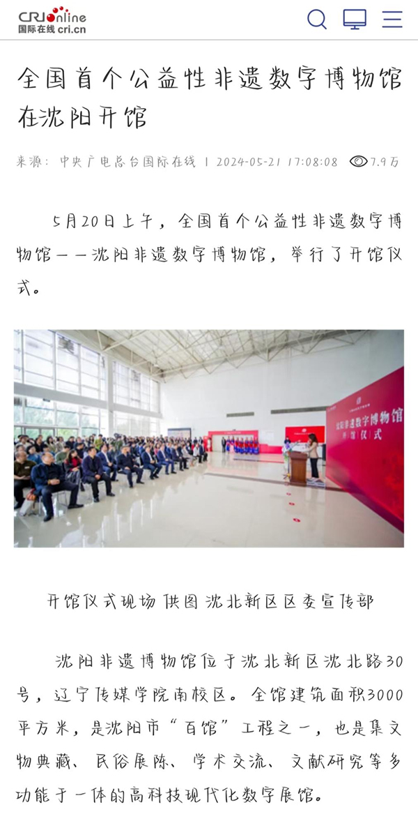 中国新闻网、中国日报、中央广电总台国际在线等十余家媒体报道:全国首个数字化非遗博物馆——沈阳辽传非遗数字博物馆正式开馆。