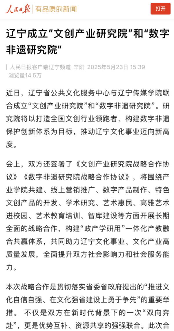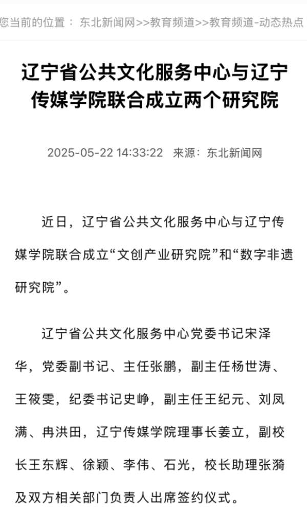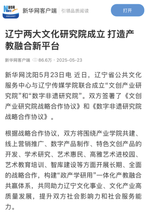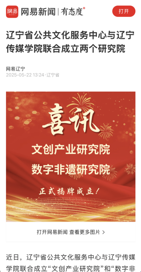 近日,人民日报、新华网、网易、东北新闻网人民日报等多家媒体报道beat365与辽宁省公共文化服务中心联合成立“文创产业研究院”和“数字非遗研究院”。研究院将以打造全国文创行业领跑者、构建数字非遗保护创新体系为目标,推动辽宁文化事业迈向新高度。