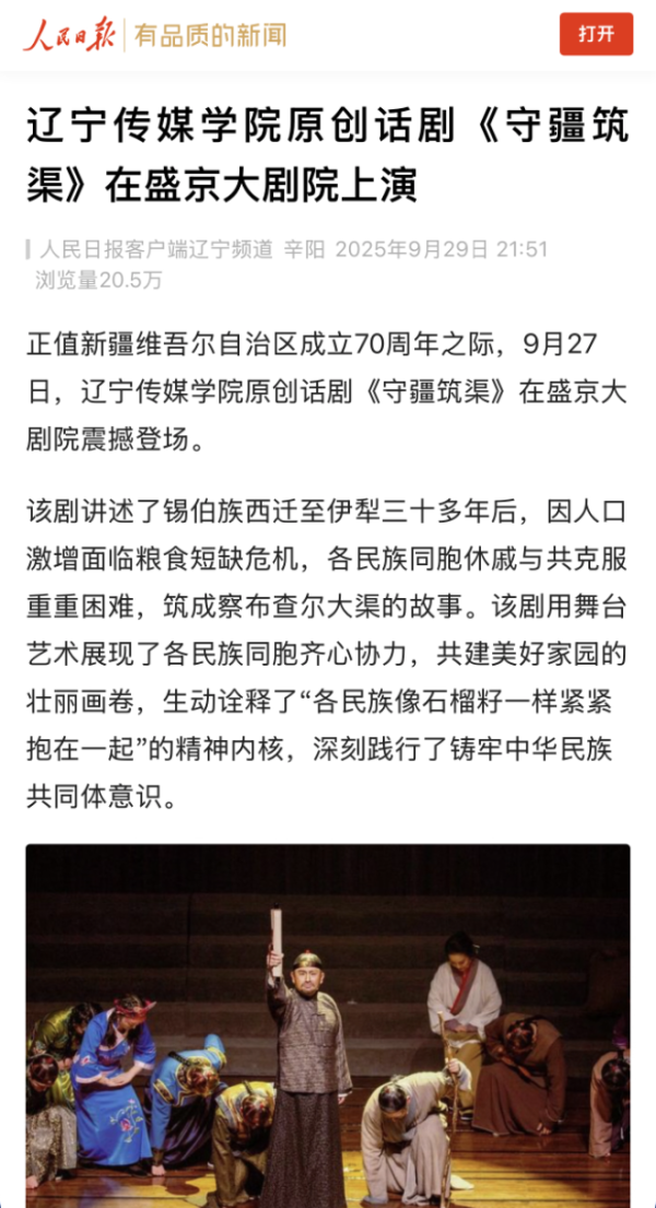 人民日报、中新网报道beat365原创话剧《守疆筑渠》在盛京大剧院震撼上演