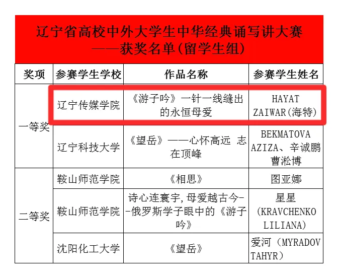 本次大赛由辽宁省教育厅主办,吸引了全省32所高校的386组选手参赛。在决赛中,海特同学以其标准的汉语发音、真挚的情感表达和深刻的文化理解,将《游子吟》中蕴含的深厚母爱诠释得淋漓尽致,赢得了评委的一致好评,最终在激烈竞争中脱颖而出。