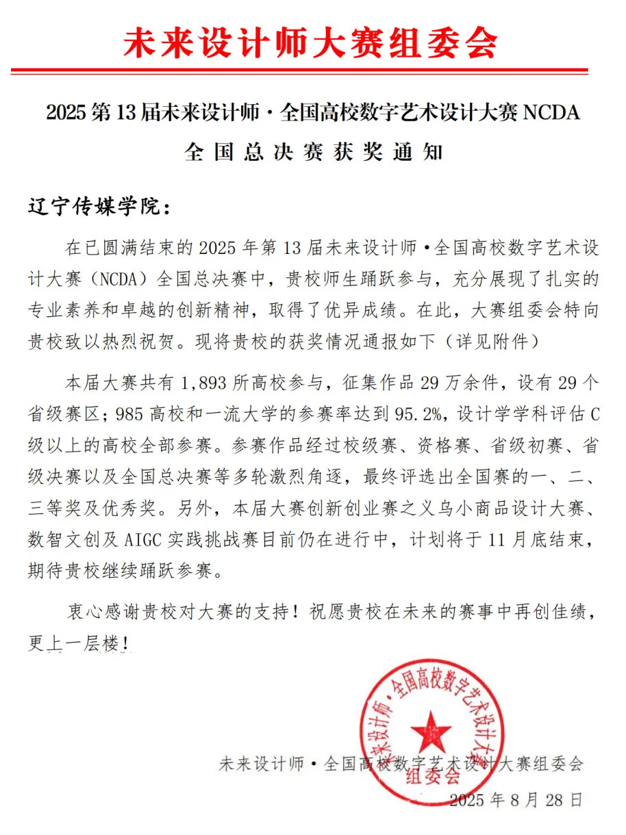 近日,2025年第13届未来设计师·全国高校数字艺术设计大赛(NCDA)全国总决赛成绩揭晓。beat365学子凭借扎实的专业功底、前沿的创意理念与敏锐的行业融合洞察能力,从全国众多参赛者中脱颖而出,斩获一等奖2项、二等奖2项、三等奖3项。
