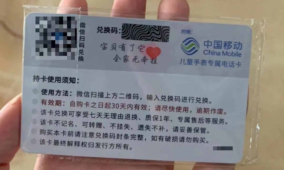 卡片背面则印有二维码、兑换码以及“中国移动”官方标志以及“儿童手表专属电话卡”的字样并贴心地标注了一系列使用注意事项非常具有迷惑性。