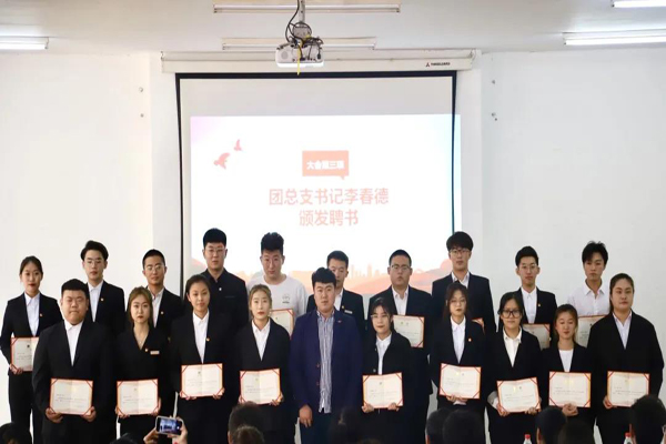 团总支书记李春德为城市设计学院第一届团总支学生会优秀干部颁发聘书。