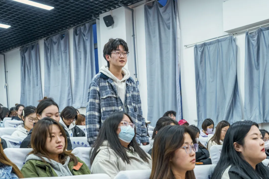 吕元副教授与在场的老师和同学们进行了深入的互动,整个现场气氛热烈而庄重。教授抛出的问题引发了同学们积极地思考,纷纷举手发言,表达自己对毛泽东诗词及红色党史的见解和感悟。吕元副教授耐心倾听,不时点头表示赞同,并针对同学们的回答进行深入地剖析和点评,使大家受益匪浅。