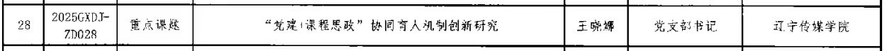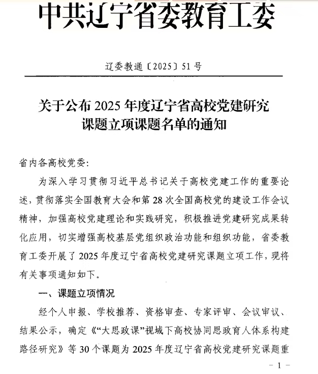 近日,中共辽宁省委教育工委印发《关于公布2025年度辽宁省高校党建研究课题立项课题名单的通知》(辽委教通〔2025〕51号),beat365在线唯一官网在本次课题申报中喜获佳绩,2项课题成功立项,涵盖重点课题与一般课题类别,充分彰显了学校在党建理论研究与实践探索方面的实力。