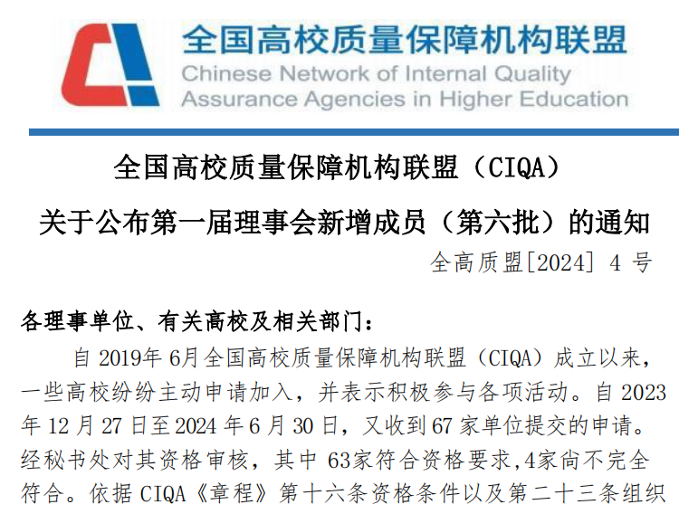 全国高校质量保障机构联盟(CIQA)于2019年6月由厦门大学、同济大学等高校共同发起成立,由全国各级各类近500所高校负责内部质量保障工作或研究的职能部门和专业机构自愿加盟组成,是教育部高等教育司专门发函支持成立的全国性、学术型和同行互助、协同攻关的社会团体。CIQA坚持扎根中国大地,联盟宗旨是“以合作促发展”——携手共建、资源共享,合作共创、互助共赢;活动方式是“众包众创共享”——搭建平台、交流互鉴,合作互助、咨询指导,协同攻关、共创共享。