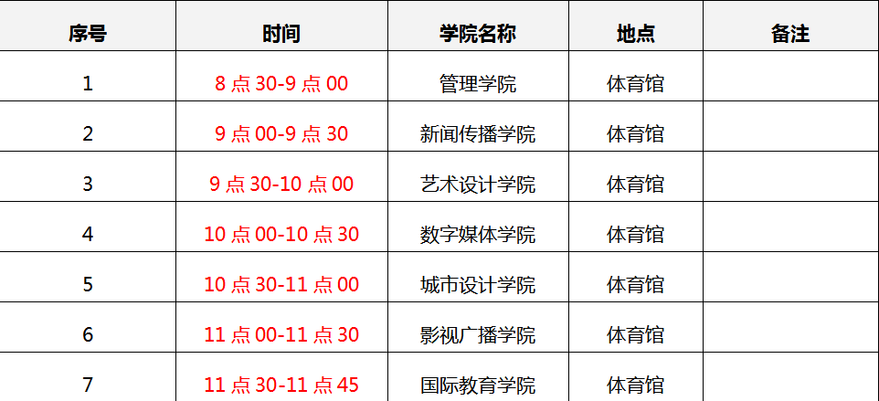 (1)各学院时间安排见下表: