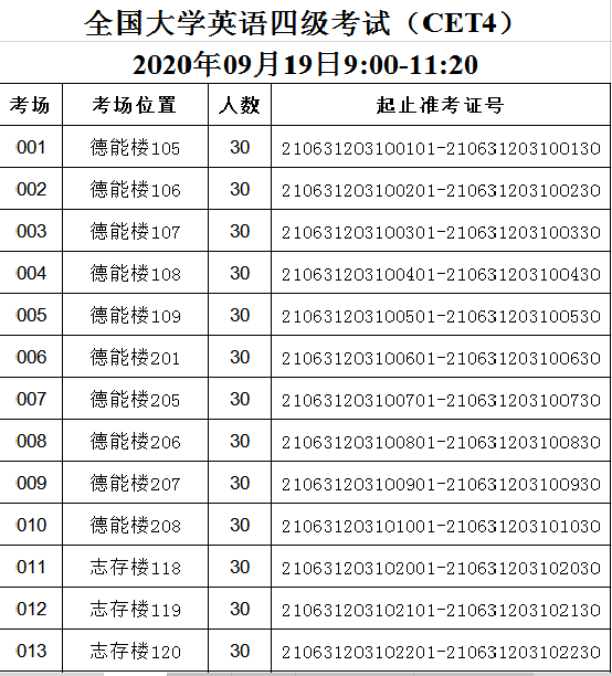 2020年上半年全国大学英语四、六级笔试考试将于2020年9月19日(星期六)举行。现将考试安排及有关注意事项通知如下: