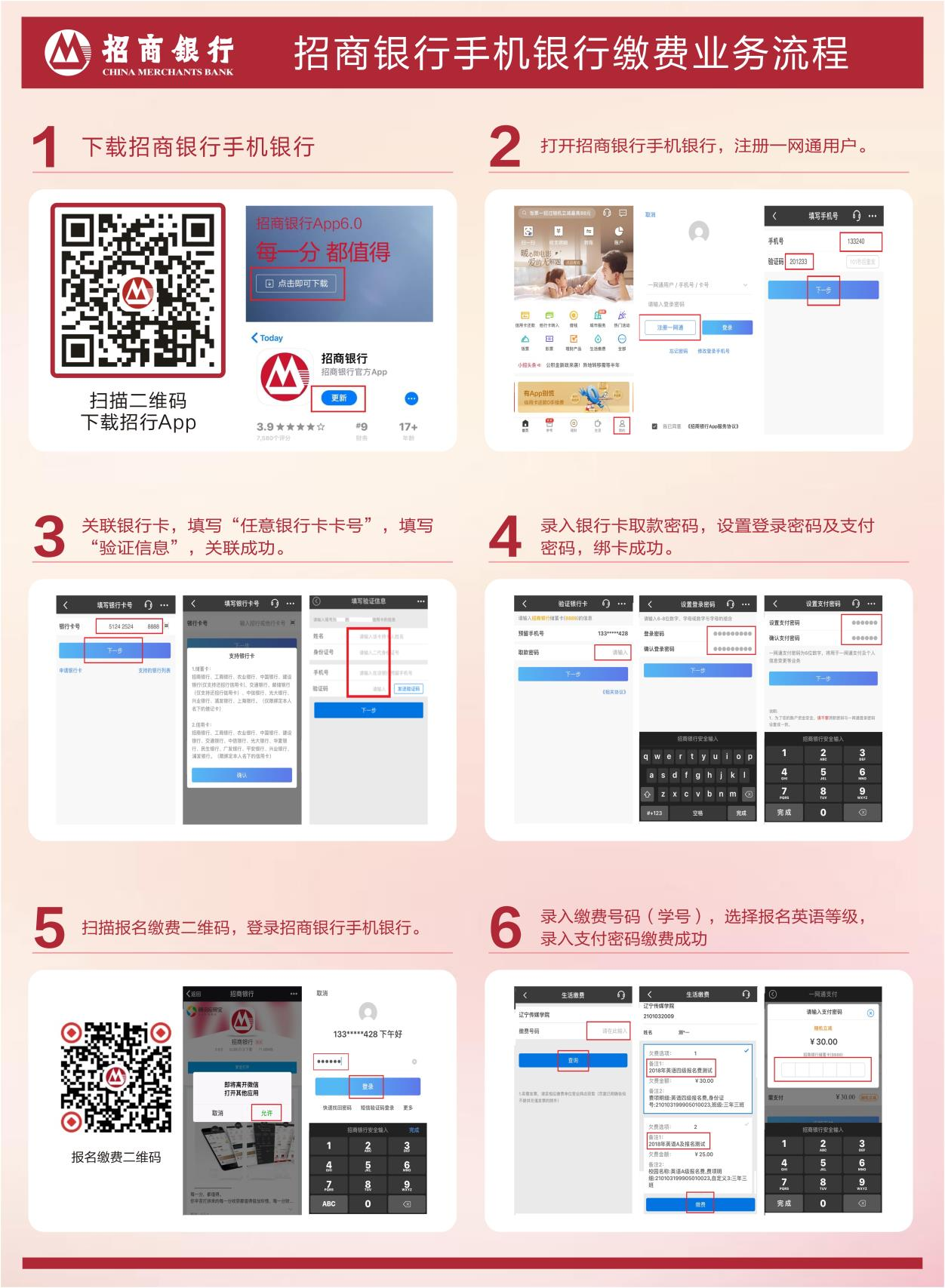 3、本次报名费收取工作采取系统收费形式,学生个人通过招行APP自行缴费,具体流程如下: