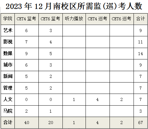 2023年下半年大学英语等级考试将在12月16-17两日举行,现需各学院上报监考、巡考人员名单,具体通知如下: