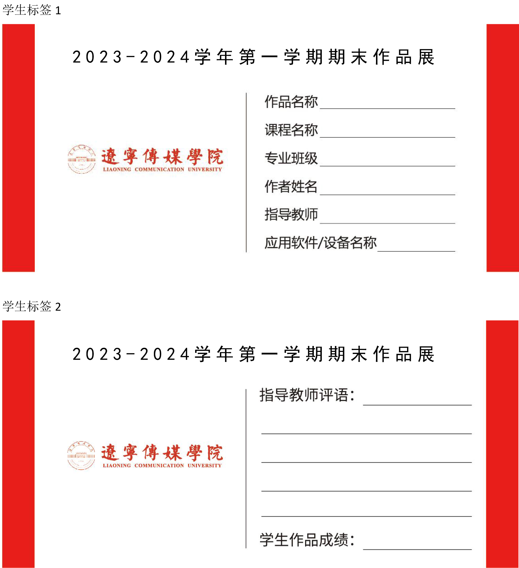 说明:已获得荣誉或奖项的作品需在教师评语后标明;学生作品成绩设置百分制,参展优秀作品成绩为85分以上;每幅学生作品有两张标签,标签1(学生信息)在上,标签2(评语和成绩)在下,统一放置在作品右下角。