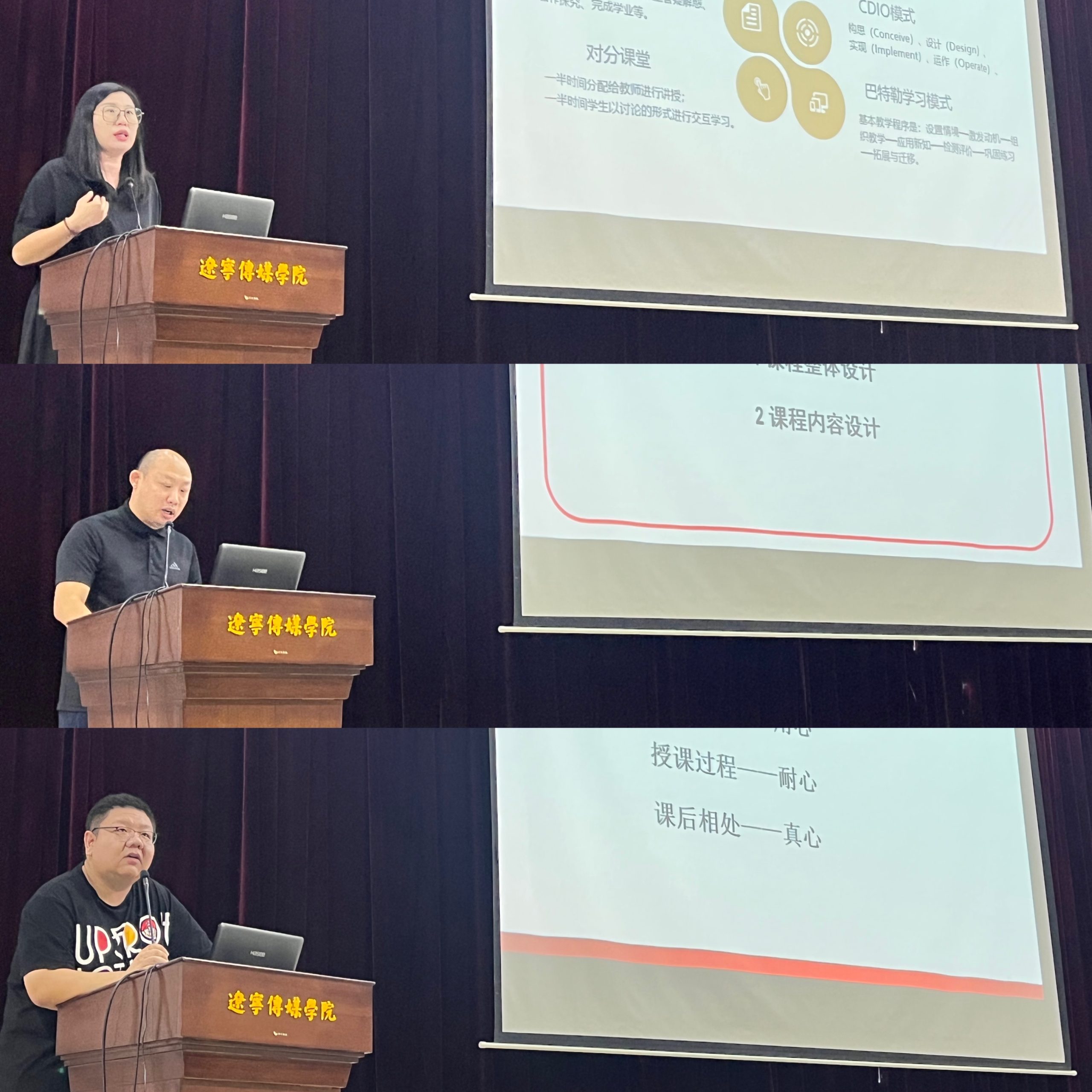 大会邀请教师代表进行了在线教学经验分享。新闻学院李岩老师以专业深度和个人魅力生动展示了优秀教师激发学生学习热情的方式方法;数媒学院的张鼎一老师介绍了极具特色的教学应用服务模式,并针对新教师,在网络教学课程整体及内容设计上进行了详细阐述;城市学院的王戈老师作为新教师代表,对自己一学期线上教学工作以“用心、耐心、真心”加以总结,并分享了与学生相处的小经验。
