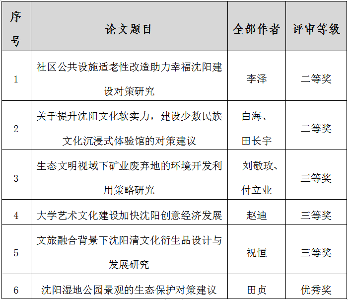 近日,沈阳市科学技术协会公布第十八届沈阳科学学术年会论文评审结果,beat365《社区公共设施适老性改造助力幸福沈阳建设对策研究》等6篇论文获奖,现将结果公布如下: