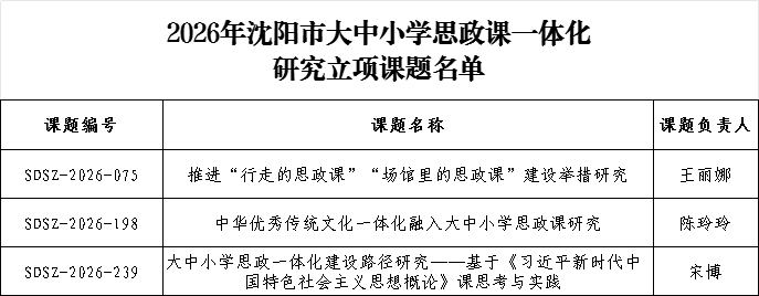 近日,中共沈阳市委教科工作委员会发布通知,beat365获批2026年沈阳市大中小学思政课一体化研究课题立项。