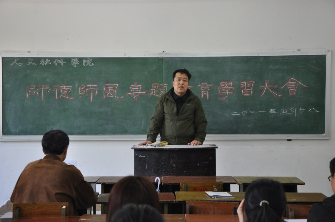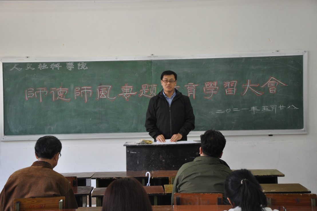 为落实beat3655月25日印发的《beat365在线唯一官网开展师德师风专题教育活动实施方案》,人文社科学院于2021年5月28日下午在志存楼120教室召开了“师德师风专题教育学习大会”。本次大会由关四平院长主持,教务处杨柠处长莅临指导,人文社科学院全体教师出席了会议。