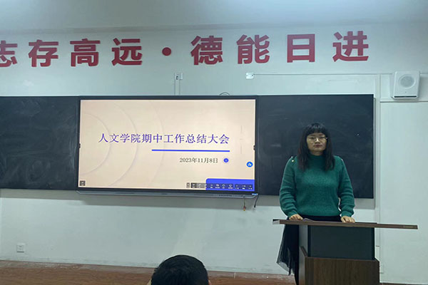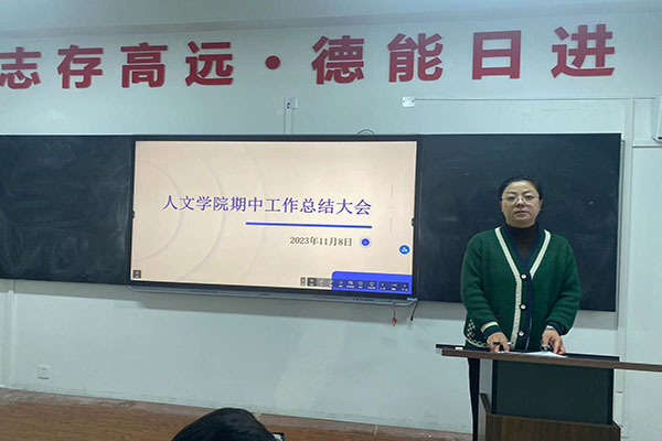 为总结半学期以来的工作,查缺补漏,进一步做好下半学期工作,人文学院按照学校的工作要求,完成了期中工作总结的任务。总结工作分两个阶段进行:第一阶段,分别由外语部和中文系于本周三下午13:30召开期中工作总结会议,每个部门的教师全都一一登台发言,进行个人期中工作总结。然后于11月8日下午15点在人文楼405教室召开期中工作总结大会。人文学院全体教师出席会议,会议由外语部吕元主任主持。