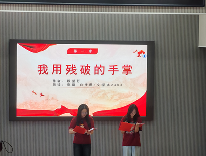 朗诵会在叶挺《囚歌》的铿锵朗诵中拉开帷幕。董维远等朗读者用沉郁而有力的声线,生动再现了革命先辈们在苦难中坚守信念、铁骨铮铮的英雄形象,让师生仿佛置身于那个风雨如晦的年代;戴望舒《我用残损的手掌》在双人朗诵中铺展家国伤痛,配合《觉醒年代》《百年征程》的群诵,完成从历史阵痛到精神觉醒的叙事升华。