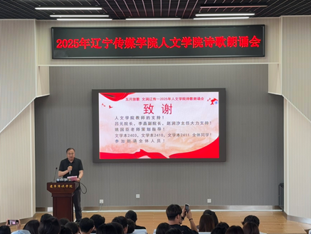 2025年5月28日,“青春放歌·文润辽传”人文学院诗歌朗诵会在管理楼112礼堂隆重举行。本次朗诵会以四个篇章串联起百年中国精神谱系,通过14组经典诗作的创新演绎,为师生呈现了一场融文学性、艺术性与思想性于一体的视听盛宴,展现了当代大学生对经典文化的传承与热爱,以及对祖国的深情厚意。