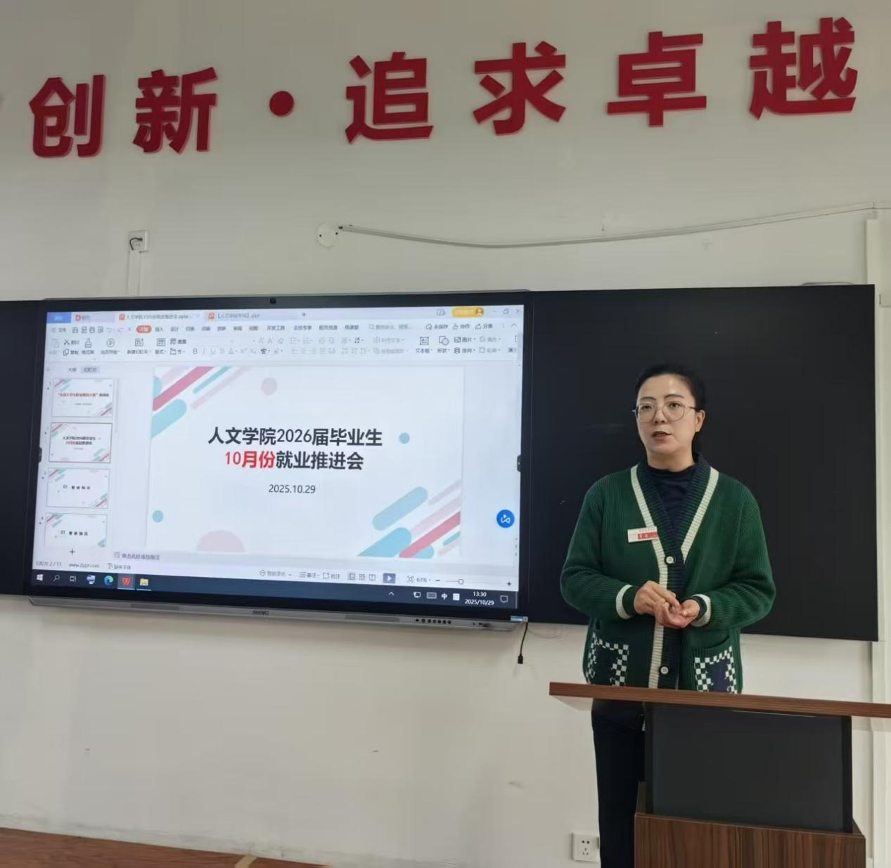 为精准推进毕业生就业工作,助力学生职业发展,人文学院于10月29日在人文楼404教室组织召开就业推进会暨第三届全国大学生职业规划大赛培训会。会议由学院副院长李晶主持,就业处副处长李旭玲莅临指导讲话,就业处张文岳、牛贺然两位老师受邀开展培训。