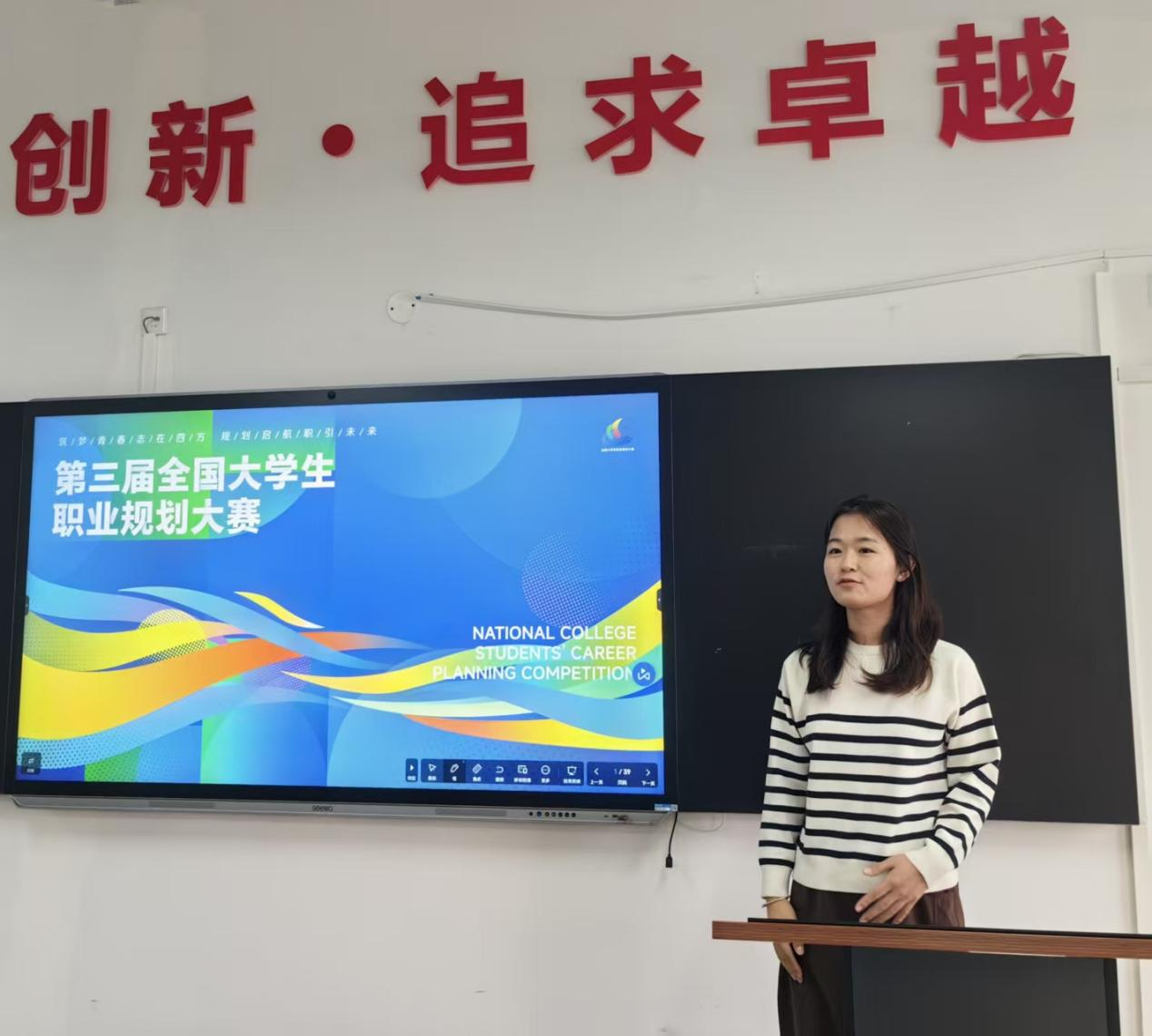 随后,就业处张文岳、牛贺然老师围绕第三届全国大学生职业规划大赛展开培训。两位老师详细介绍大赛定位、主题“筑梦青春志在四方,规划起航指引未来”,以及院赛、校赛、省赛、国赛四级赛制;重点解读三大赛道要求:成长赛道面向本科低年级学生,侧重职业目标合理性与成长过程;就业赛道针对本科高年级学生,考察岗位匹配度与求职实战能力。