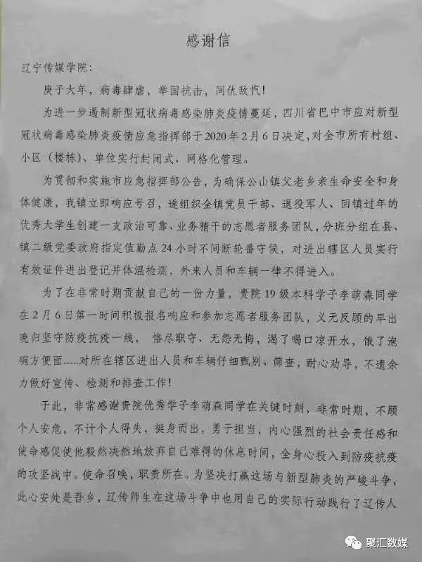 于此,非常感谢贵院优秀学子李萌森同学在关键时刻,非常时期,不顾个人安危,不计个人得失,挺身而出,勇于担当,内心强烈的社会责任感和使命感促使他毅然决然地放弃自已难得的休息时间,全身心投入到防疫抗疫的攻坚战中。使命召唤,职责所在。为坚决打赢这场与新型肺炎的严峻斗争,此心安处是吾乡,辽传师生在这场斗争中也用自已的实际行动践行了辽传人的优良传统和品质,展现了辽传人的责任与担当,把小我融入大我,奉献着自己的青春力量。