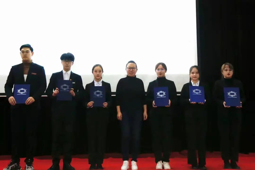 会议现场,由数字媒体学院党总支副书记贺苗苗老师为第一届团总支学生会主席团颁发聘书。