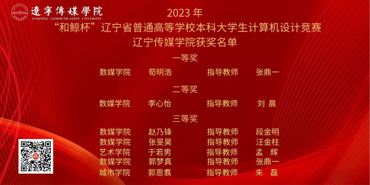 近日,由辽宁省教育厅主办的2023年“和鲸杯”辽宁省普通高等学校本科大学生计算机设计竞赛圆满落幕。经过组委会专家组对参赛作品进行公平、公开、公正的评审,我院张鼎一老师指导数媒学院荀明浩陈慧琳李晓婷于秋月霍佳豪同学获得一等奖。我院刘晨老师指导数媒学院李心怡朱婧绮孙一航卢嘉睿宋燕姬同学获得二等奖。