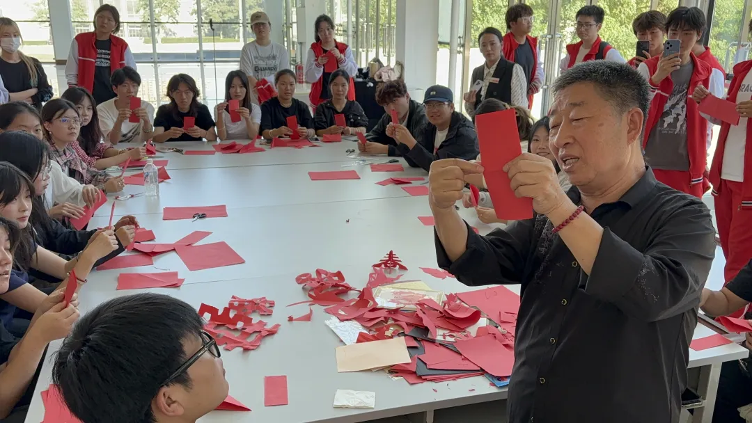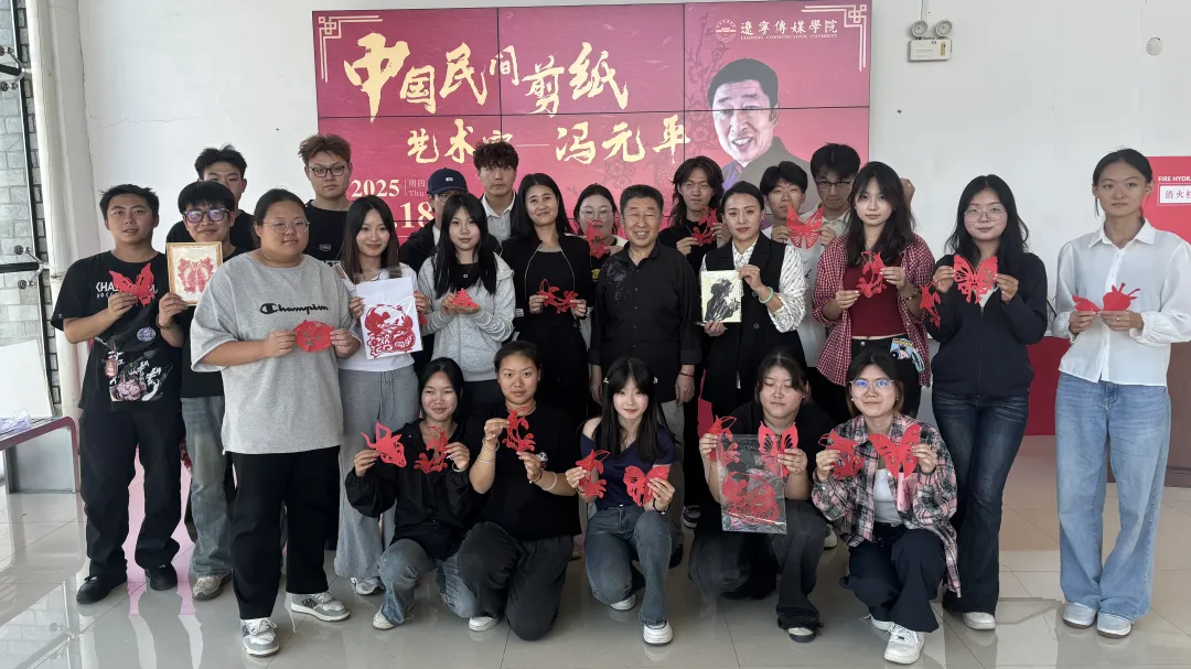 实践环节,同学们从基础纹样学起,亲身感受剪纸 “以剪代笔、以纸为媒” 的魅力,完成一幅幅创意作品。活动尾声,冯元平老师和辽传师生与剪纸作品合影留念,定格温暖瞬间。