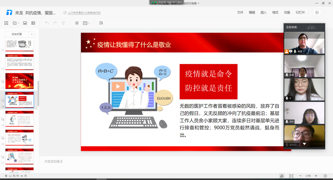 班会主要围绕疫情防控相关知识,通过让同学们观看抗击疫情视频;辅导员引领、梳理、总结;团支书带领同学们参与发言和讨论的方式进行。主要学习了“外媒舆论下的中国疫情”、“中国外交天团硬核回应”、“第一时间,重要部署”、“武汉是英雄的城市,武汉人民是英雄的人民”等重难点问题。除此之外,还进行了“疫情下的木桶效应你知多少”等趣味性问答,从工业生产、微观企业、服务业、医疗业等多方面,全方位的进行了探讨研究,使同学们深刻意识到疫情带给我们生活中的影响。