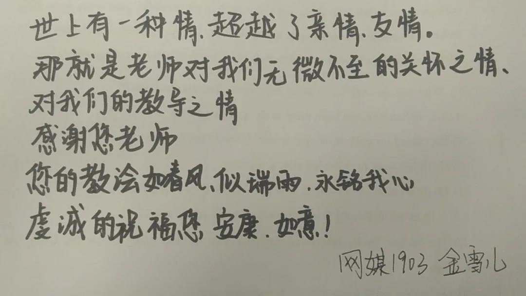 十年树木百年树人,老师恩情比海深。很庆幸,在短暂的人生中与您相遇,和您相处的时光很充实,您的教导,我铭刻在心;您的关怀,我感激在心;您的帮助,我感谢在心。谢谢您,老师!